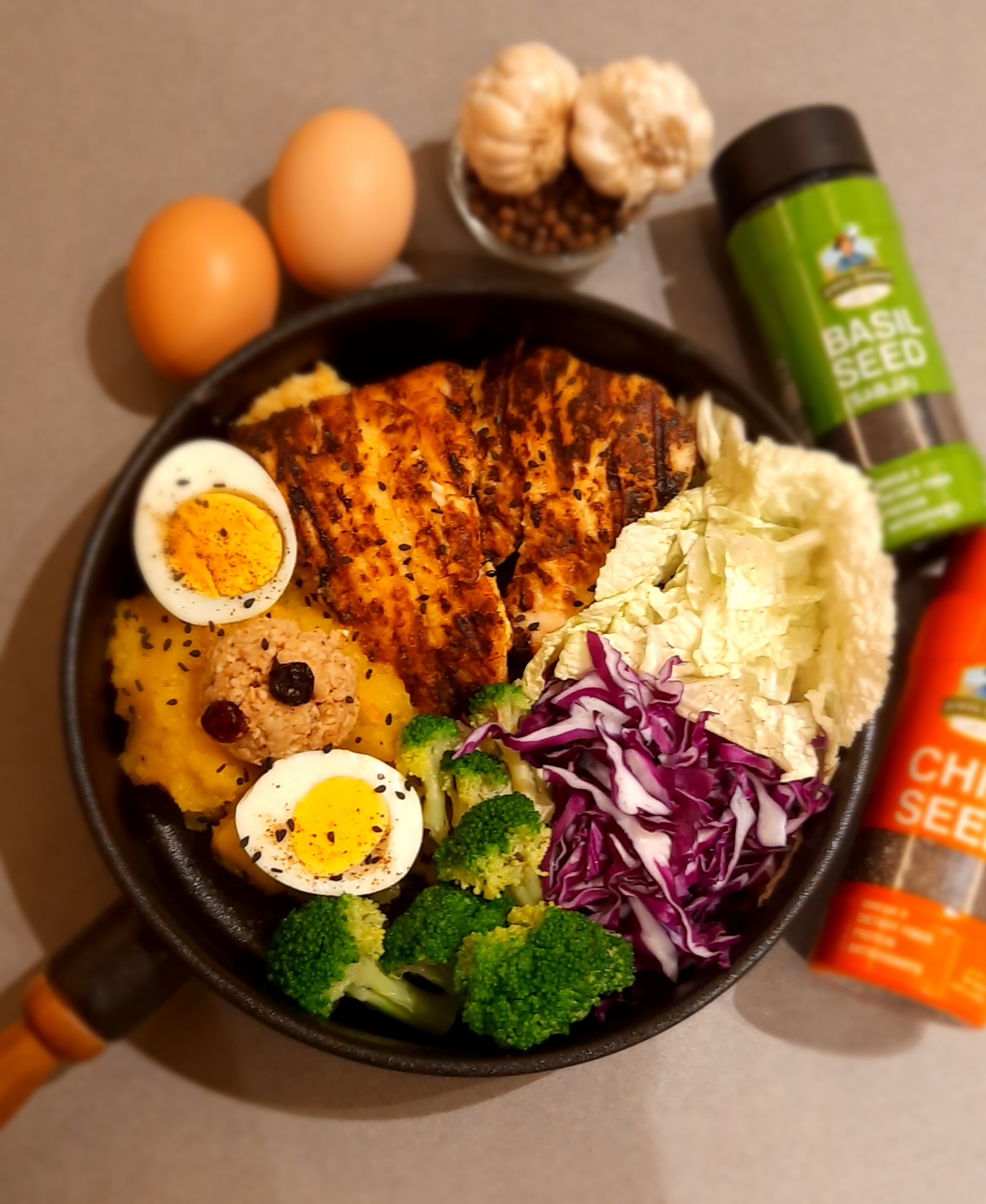 Enriched with goodnes of Cod Liver Oil, our talk of the town ‘Bulgogi Salmon Bowl’ is prepared in extra light olive oil and served with exotic veggies like steamed broccoli, red cabbage, lettuce, super food pumpkin. This exotic recipe is crowned with treat of oats ball ,blue berries and basil seeds.