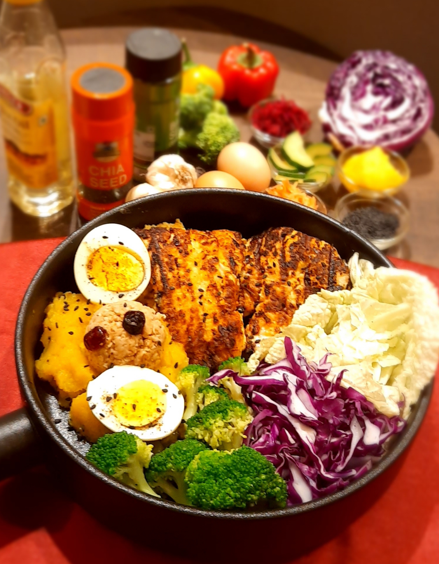 A power pack bowl of nutrition containing tender boneless pieces of chicken that are served with super delicious steamed brown rice, brown eggs, red cabbage, broccoli and juicy carrots.